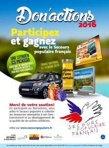 La campagne 2016 du Don’actions prendra fin, en Corrèze, le 16 mars avec le tirage au sort départemental où il sera possible de remporter une croisière sur la Méditerranée ainsi que de nombreux autres lots. Chaque ticket-don de 2 € permet également de participer à un tirage au sort national qui aura lieu le 18 mars à Paris et dont le premier prix est une voiture.